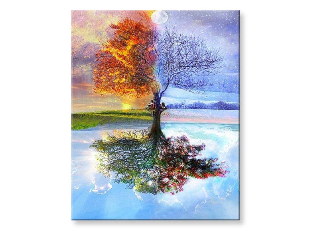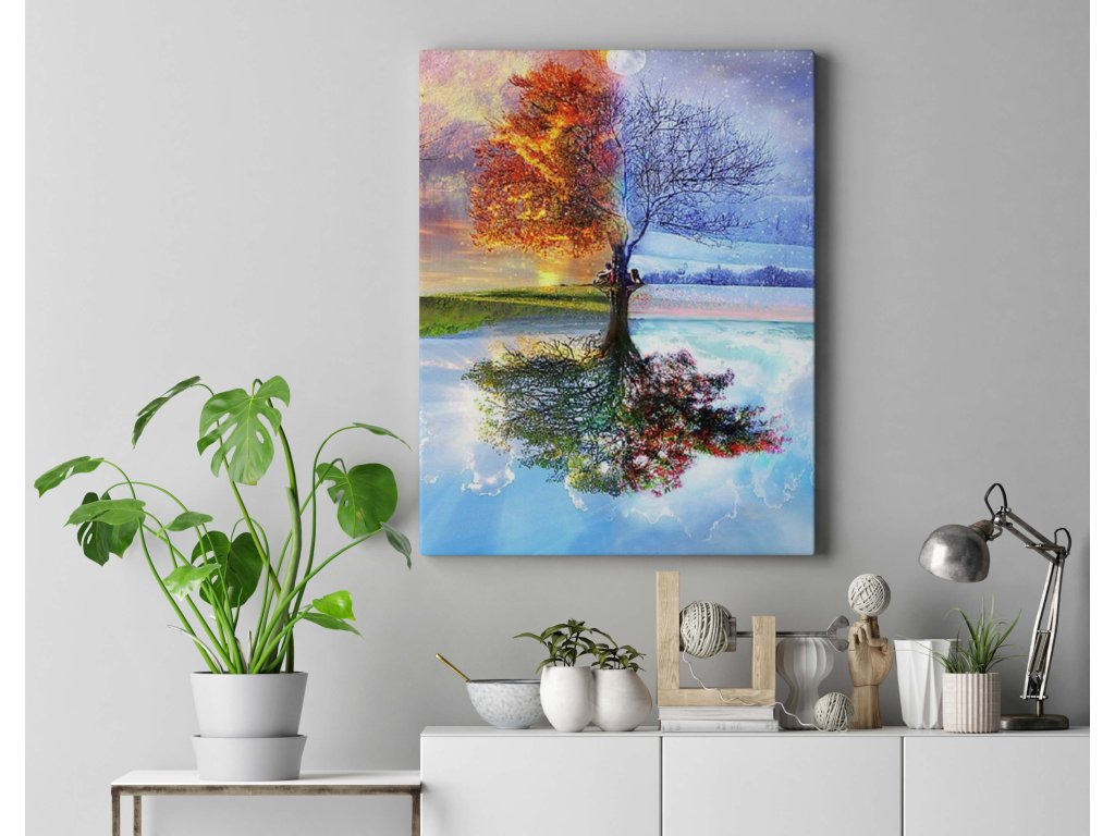 Neuvěřitelný koloběh jara, léta, podzimu a zimy pocházející z mistrovského díla matky přírody. Unikátně zobrazené kouzlo čtyř ročních období v podobě stromu opředeného modrou oblohou a bílými obláčky zrcadlícího se na hladině jezera. U silného kmene stromů se tiše choulí dvě postavy obdivující krásu života samotného.