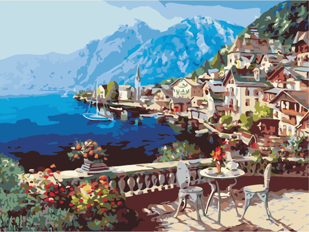 Stolek se dvěma židlemi na sluncem ozářené terase přímo vyzývá k vychutnání šálku kávy nebo sklenky vína. Za kamenným zábradlím se rozprostírá nekonečná dálka modrého moře. Strmý břeh pokrývají krásné domky a v dáli se majestátně tyčí vrcholky hor.
