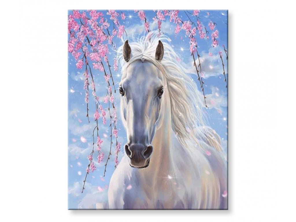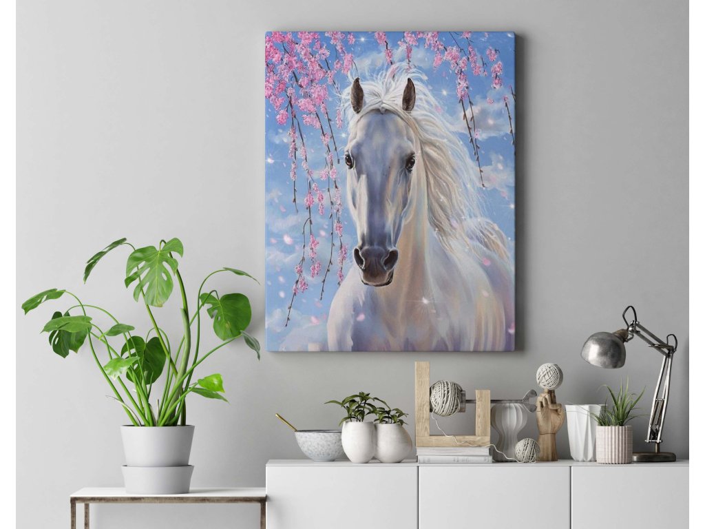 Koně jsou vznešení zástupci zvířecí říše. Při pohledu do koňských korálkových očí vás ohromí jejich krása podtržená elegancí křivek těla bílého koně s hřívou vlající ve větru pod záplavou růžových květů na jemných větvičkách. Bílý kůň je symbolem propojení čistoty, hbitosti a energie.