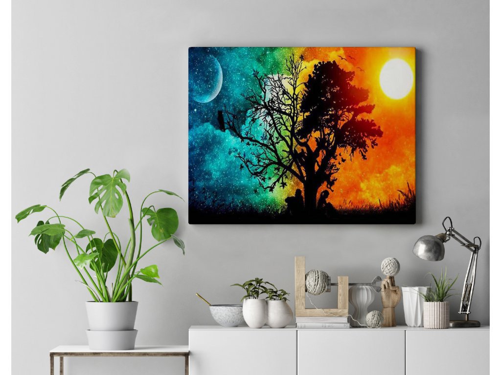 Unikátně zobrazený nekonečný koloběh dne a noci. Strom jakoby se ocitl na bodu zlomu. Jedna jeho tvář je opředena zimou pod stříbřitým svitem měsíce ve společnosti sovy a druhou tvář nastavuje hřejivým paprskům slunce a náruči ptáků. Tiší milenci opření zády k sobě o kmen stromu jakoby se k sobě nemohli přes časoprostor dostat.