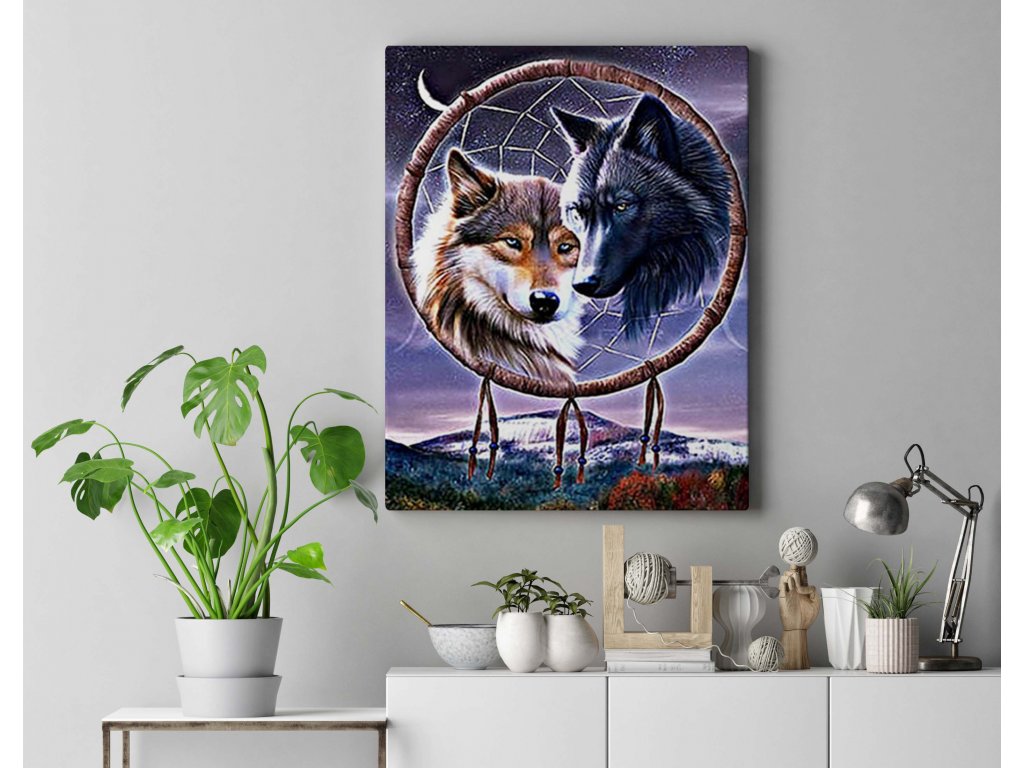 Pořiďte si svůj lapač snů v podobě krásného obrazu. Vlk je indiánské totemové zvíře, které je symbolem mužnosti a síly. Vlci jsou také znamením sebevědomí a odvahy. Pár silných psovitých šelem vám dodá sílu každý den. Dejte domov zástupcům vlčí říše, kteří se ukazují ve své kráse a budou střežit vaše sny.